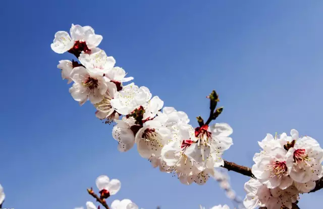 杏花也没有花柄,但它一般是一簇簇挤在一起贴着花枝开,花瓣圆圆的很像梅花,但是花萼鲜红,颜色分明。