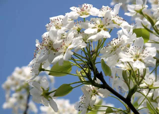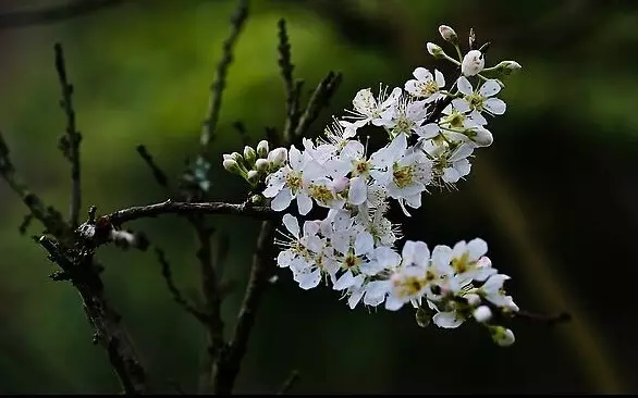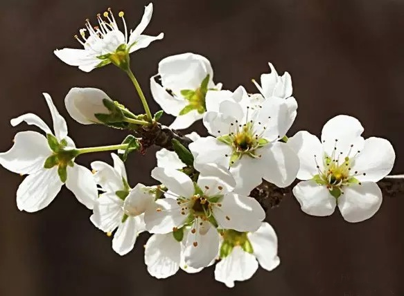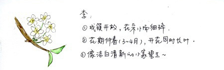 再来看看读起来很像的李花和梨花。它们都是白色花瓣,但李花的花蕊是黄色,梨花的花蕊是紫红色。而且,梨花开得比较晚,大约要等到4月初。