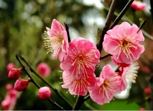 2、花先叶开放,花瓣倒卵形或近圆形,淡红色或白色。